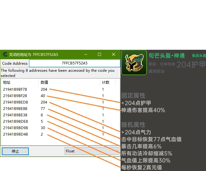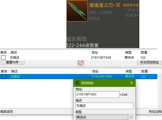 第七布:CE得到的地址就是想要修改的装备的属性值。