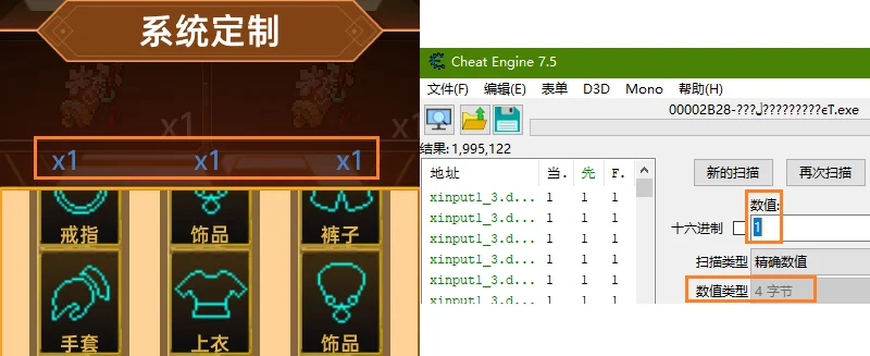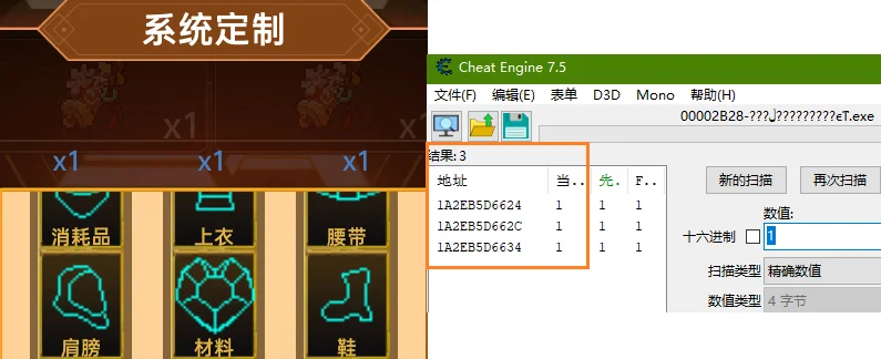 第一步:先将抽奖系统升到3级,按刷新进入系统定制。去CE搜索得到的值,数值类型是4字节(例如搜索1)。