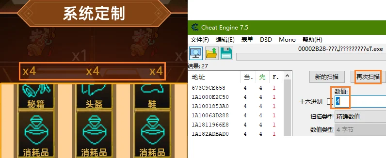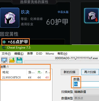 第二步:洗练一下改变护甲数值,用CE‘再次扫描’(例如再次扫描66),减少得到的结果。重复这一步,直到只有一个结果。