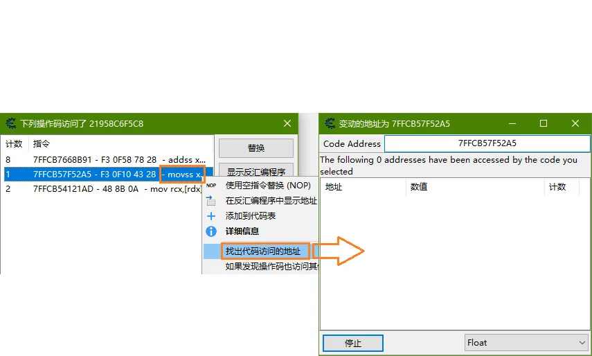 第五步:这时CE会出现几个指令记录。选择有‘movss’的那个,右键‘找出代码访问的地址’。