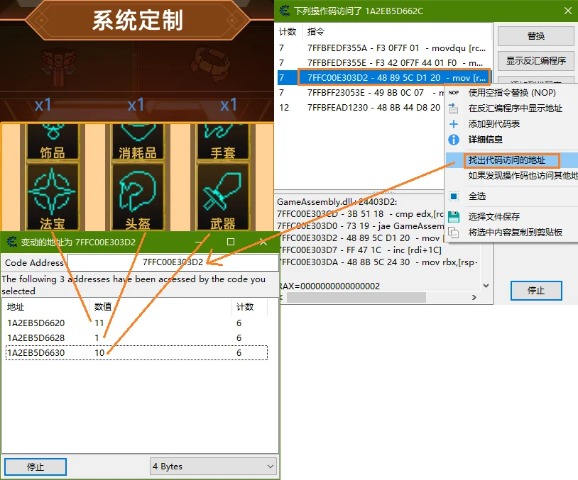 第五步:按‘开始’再刷新一次,得到几个指令记录。选择‘mov [r...’那个,右键‘找出代码访问的地址’。最后的到的3个值分别对应当前的装备类型(例如11代表法宝,1代表头盔,10代表武器)。