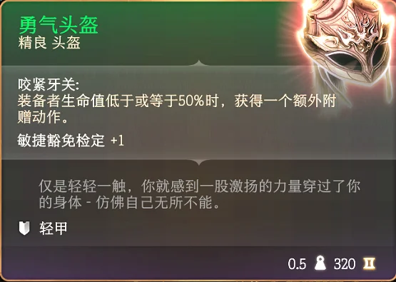 装备者生命值低于或等于50%时,获得一个额外附赠动作。