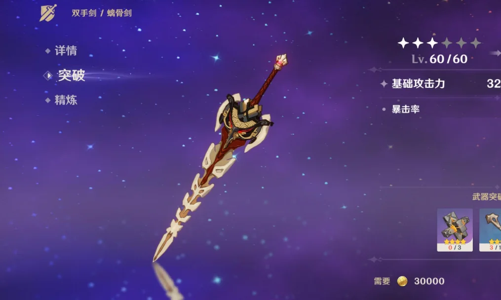 1、开服的万金油大剑优秀的属性,很多主c输出都能选择,副词条暴击率缓解圣遗物压力。
