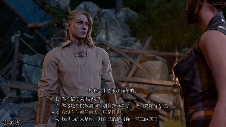 作为玩家,最基本的要求就是不要刺探她的隐私,制定计划时要缜密严谨,遇到危险不能鲁莽开打,偶尔来两句俏皮话她也不会介意。影心其实还是很享受其他人的赞美的。在德鲁伊营地遇到有困难的小朋友一定要给予帮助,但是大人受难她似乎不是很在乎,在地精营地折磨囚犯时她却无动于衷。如果玩家选择最后和地精一起屠杀德鲁伊营地,影心会很不舒服。明明是莎尔信徒但是却尚存一些良知,影心的身份越来越神秘了。