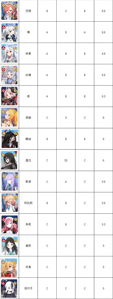 5-5.9分,强度比较一般或者未来可期型角色,某些角色某场合较为好用有需要的话就看着练,而其它的角色不建议练