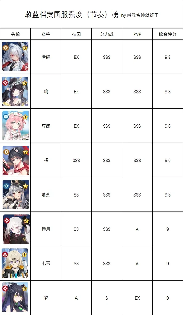 国服强度(节奏)榜单包括推图、总力战、PVP(战术对抗赛)和综合评分