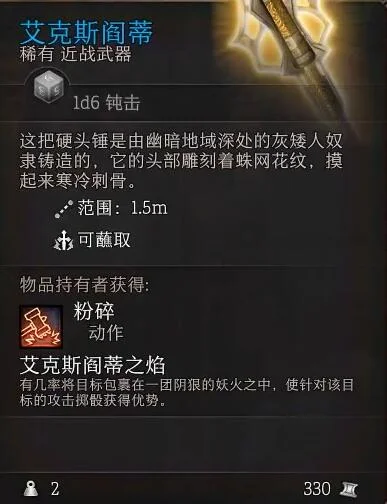 1、艾克斯阎蒂:1d6钝击,单手近战钉锤:有几率使被攻击者处于妖火中,针对目标的攻击检定获得优势。