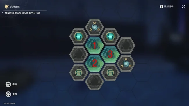①2号板块,顺时针(D键)旋转2次;②1号板块,的顺时针(D键)旋转2次;③1号板块,的逆时针(A键)旋转1次;即可解密完成。
