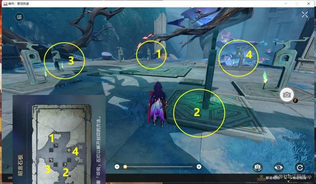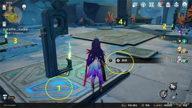 (4)下图为第3处解密顺序,先打了这里中间的怪后,【调查】中间位置获得解密提示石板,按照石板顺序,依次【触碰】即可完成该处解密
