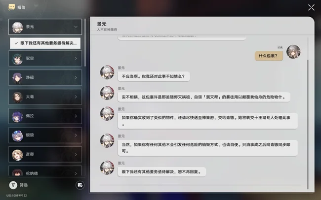 2、1.2版本更新后,走到丹鼎司这个位置,景元元会给你发短信哦告诉你有没有收到危险包