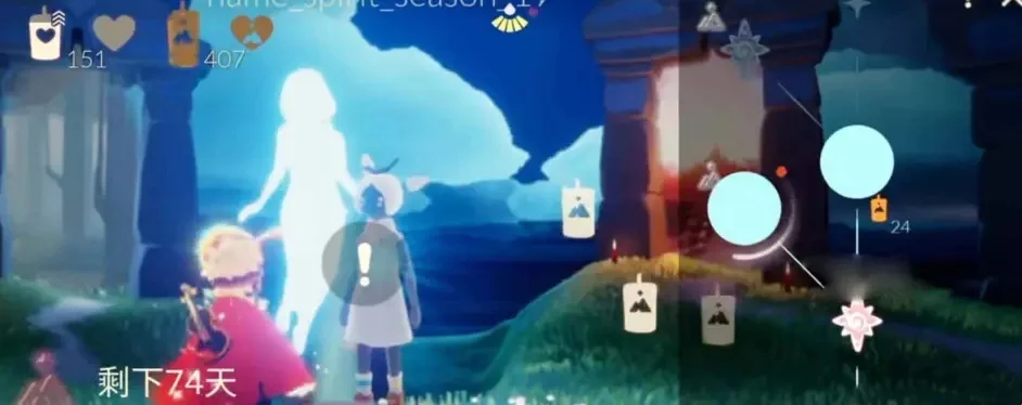 1、新地图向导先祖位置往左侧飞可以看到巨石林立的区域,顺着山洞一直往里飞,在中间的石柱后面可以找到第一位季节先祖。