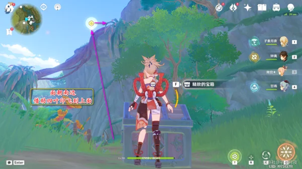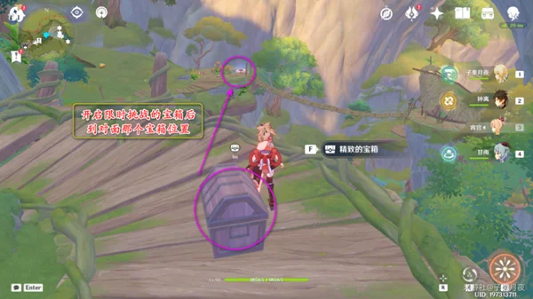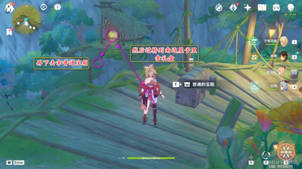 然后看向南边,木屋里有个礼盒,飞过去拿取;下面还有个普通宝箱;