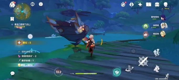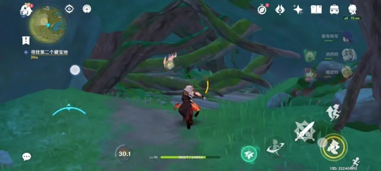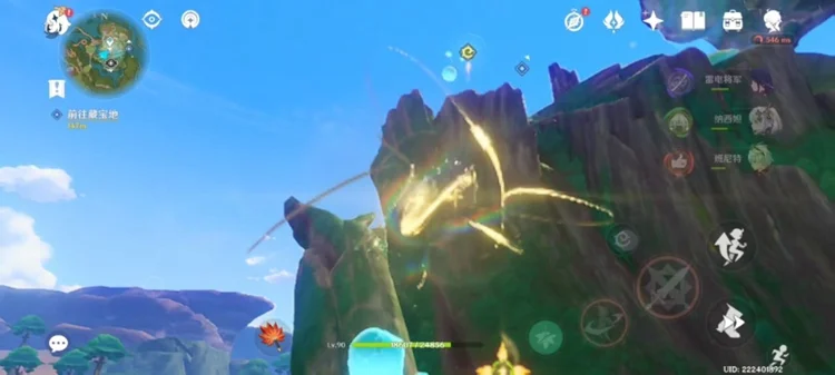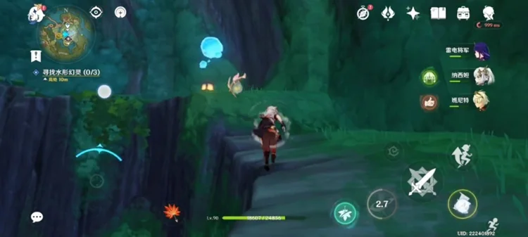 靠近之后,这个水形幻灵就会变成蓬蓬果,这里我们调查一下,然后通过弓箭角色击破飞到空中的三个蓬蓬果。(我们可以使用一些带追踪弓箭的角色来解决问题。例如宵宫和提那里。