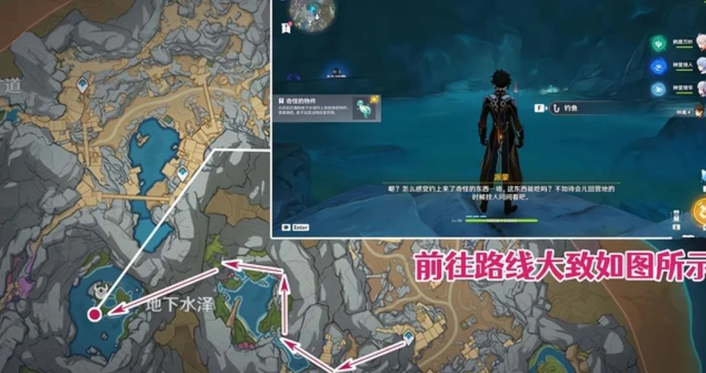2、前往地下水泽钓鱼会钓到一个“奇怪的物品”,然后与海迪夫对话可以出发后续任务;