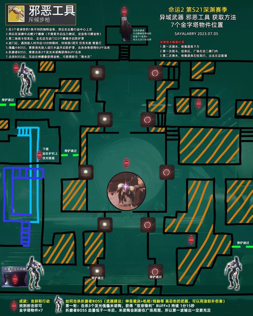 折磨者BOSS:需要击杀3个发光米诺陶获得“致命锋利”BUFF×3(持续1分15秒)才能造成伤害(分布如图)。武器建议:神圣裁决+机枪/线融等 高总伤的武器,可以用渎职补伤害。折磨者BOSS 血量低于一半后,米诺陶会刷新在广场周围,所以第一波输出一定要充足
