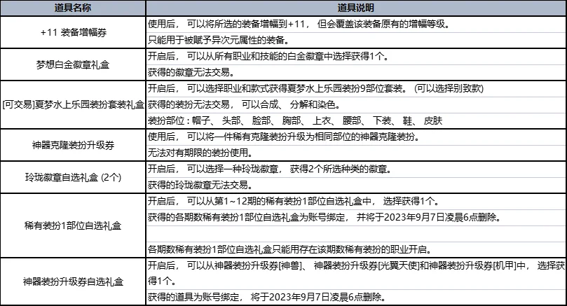 开启后, 可以获得1个梦幻克隆装扮礼盒 (武器) 和1张夏梦水上乐园礼包7折优惠券。获得的道具为账号绑定, 并将于2023年9月7日凌晨6点删除。
