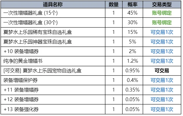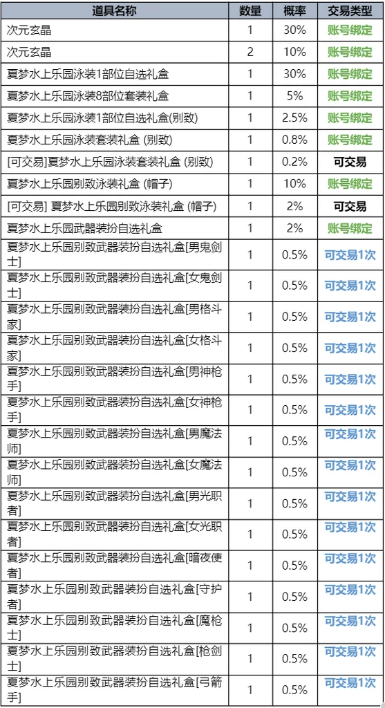 开启后,可以从2种夏梦水上乐园宠物中,选择获得1个。获得的宠物无法交易,没有删除时间。