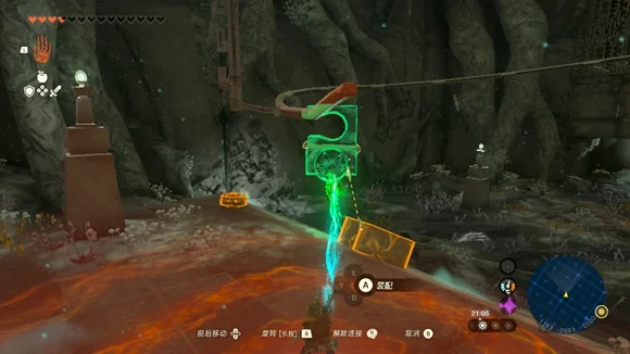 3、这里需要通过轨道把右脚工坊传送到对面,但是轨道是有铁架子支撑的,不可以直接过,玩家需要把把钩子弄成左凹的方向,把右脚工坊粘合上去,再装个风扇,击打传送。