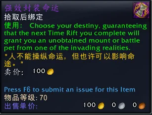 一次性道具:强效封装命运(在下次完成时光裂隙事件时保证获得一个未获取的时光裂隙商人出售的坐骑或宠物)