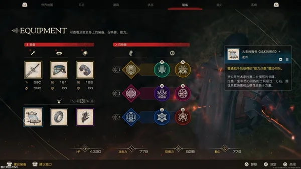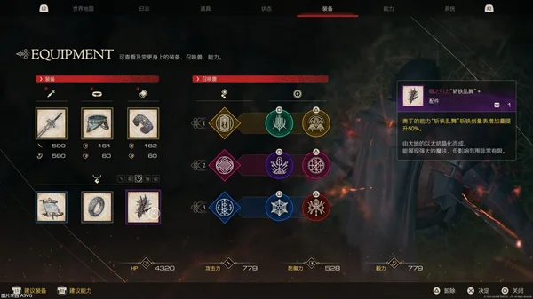 2、装备“古老教诲书《战术的报应》+”(二周目用两本这个书合成高阶版,能力点数增加40%),以及“暗之引力 斩铁乱舞+”(没有也没事),对着土狼施放斩铁乱舞,斩铁剑蓄力槽到5级之后,长按方块然后松手可以全屏秒杀(不要让土狼被石头挡住了或者离太远),可以获得1120能力点数。
