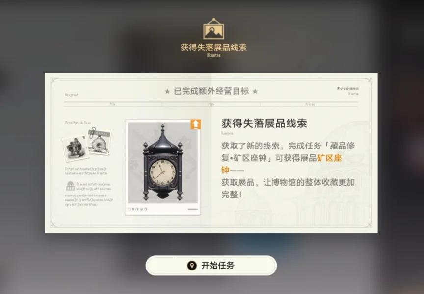1、完成额外经营目标:将工业区升级至7级,并完成1次经营之后触发新的藏品任务修复矿区座钟