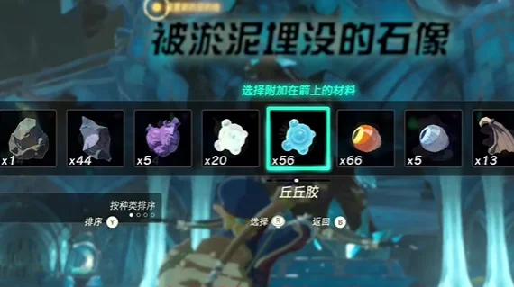2、接着就是需要使用弓箭,再将这个丘丘胶附加在箭上面,然后对准这个石像。