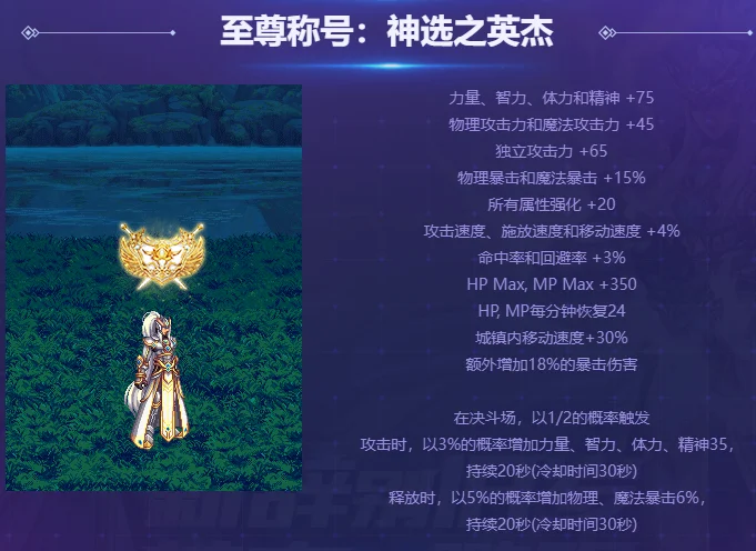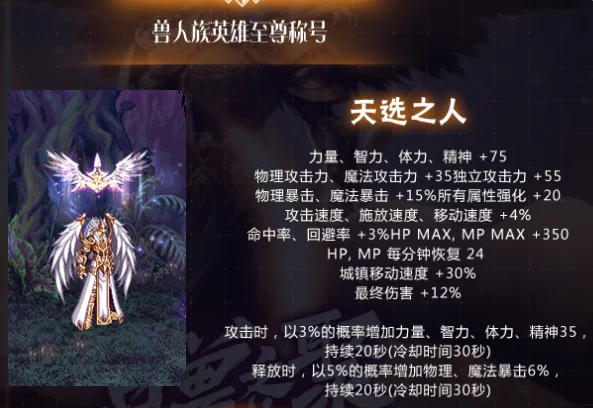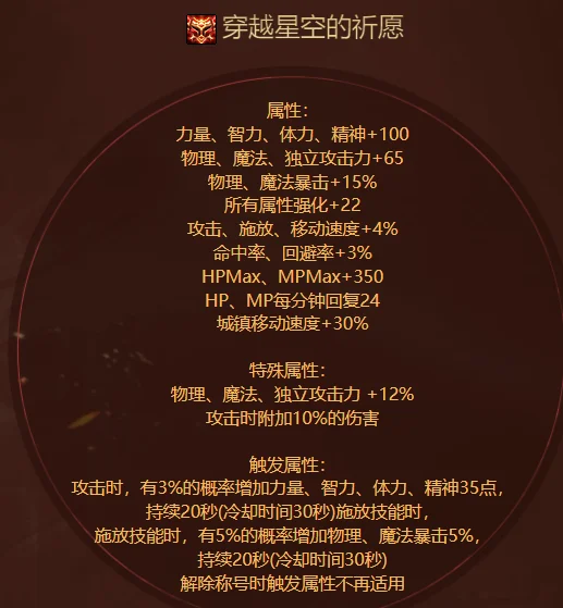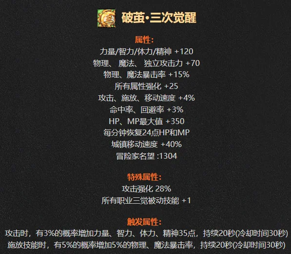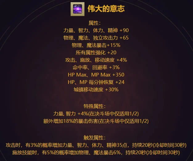 攻击时,有3%的几率增加力量、智力、体力、精神+35,效果持续20秒(CD30秒)