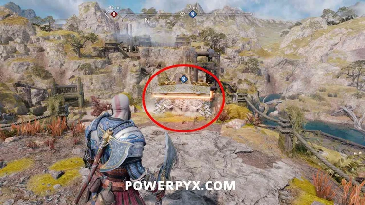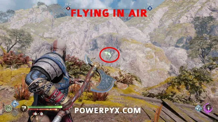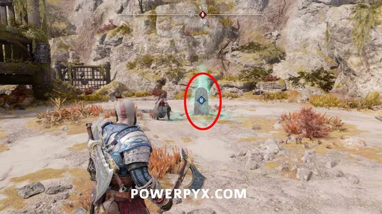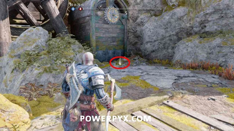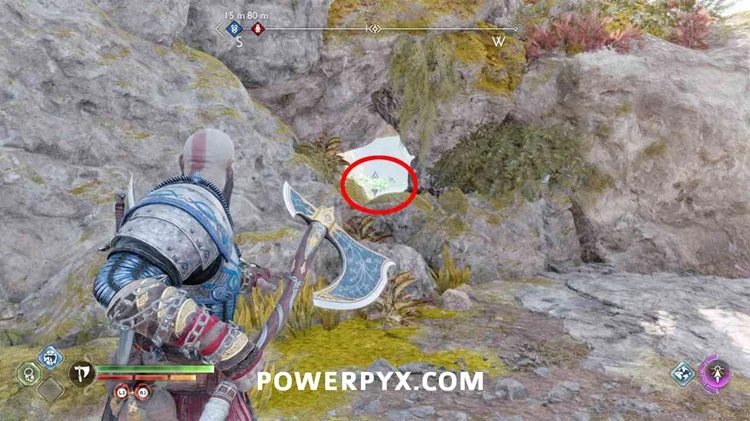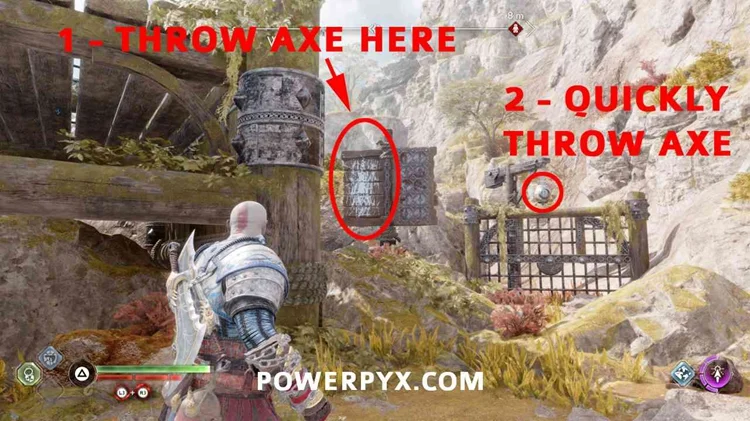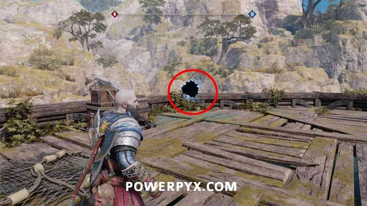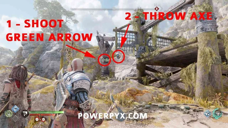 后,前往路径的尽头。断桥的左边是一些绿色的音石,射出绿色的箭矢将它们炸毁。在这些后面,您可以找到一只乌鸦在盘旋飞行。当斧头飞过时扔掉它。
