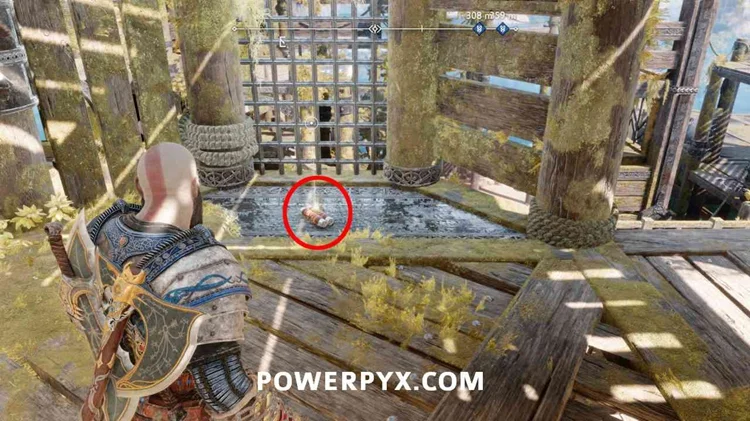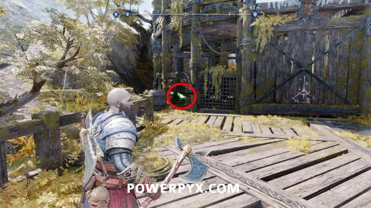 从采矿机转身向左看。你可以用+:广场:向:l2:花瓶射绿色箭头。然后你可以绕过花瓶后面的墙(墙上有白色图标表示攀爬路径)。跳到金色链条上,滑下链条,再次使用轮子将抓斗点抬到最顶部。爬回同样的金色链子,现在你可以使用抓钩跳过去,在半空中按压:圈:砸穿墙壁。传说卷轴在这里的地板上。
