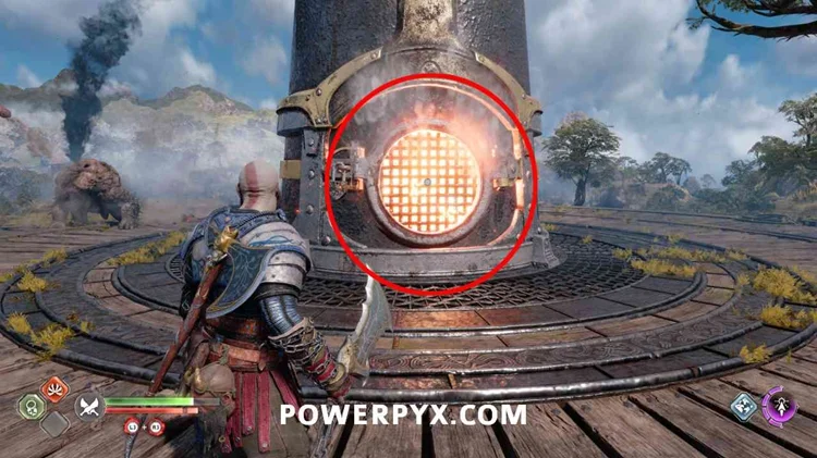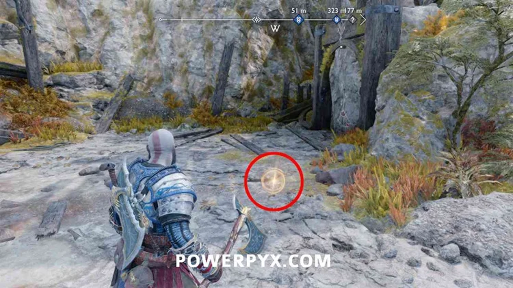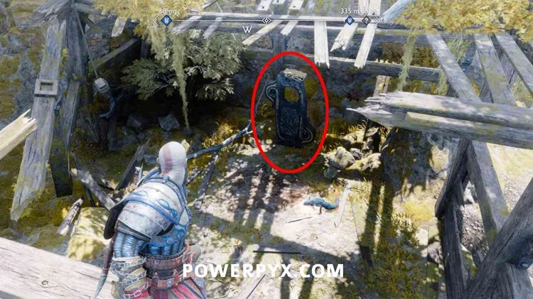 现在爬上墙,将斧头扔向右侧的标志旋转它,这将打开大门。跳过并爬上塔,你会发现箱子在上面。这个宝箱可以包含一颗穆斯佩尔海姆种子(如果你还没有找到其中的 2 颗)或神圣的灰烬(如果你已经找到了 2 颗穆斯佩尔海姆种子)。