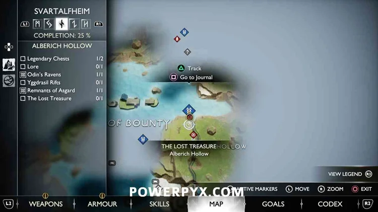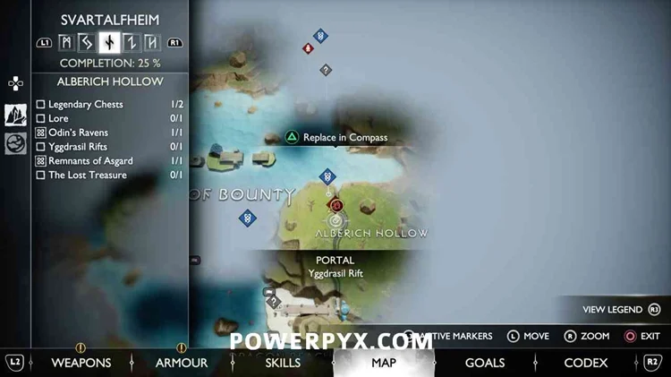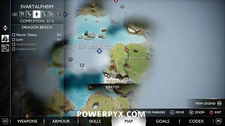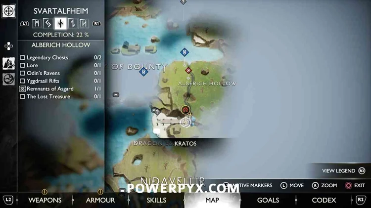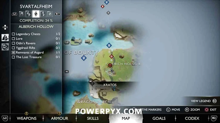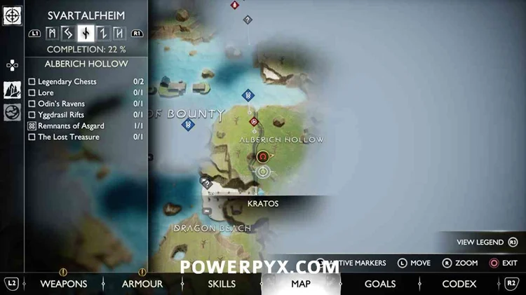 要进入阿尔贝里希山谷,您首先需要长矛(主任务 10:锻造命运的故事解锁)。去“龙滩”地区,爬上海滩左侧的金链。然后你必须向从木杆出来的风投掷长矛,这创造了一条爬上去的路径。爬上去后,立即检查右上角是否有可以与之交谈的鬼魂。他给你“失落的宝藏”的恩惠。目标位于Alberich Hollow的最尽头(在地图上用蓝色图标标记)。现在继续其他收藏品,我们将在最后完成目标。