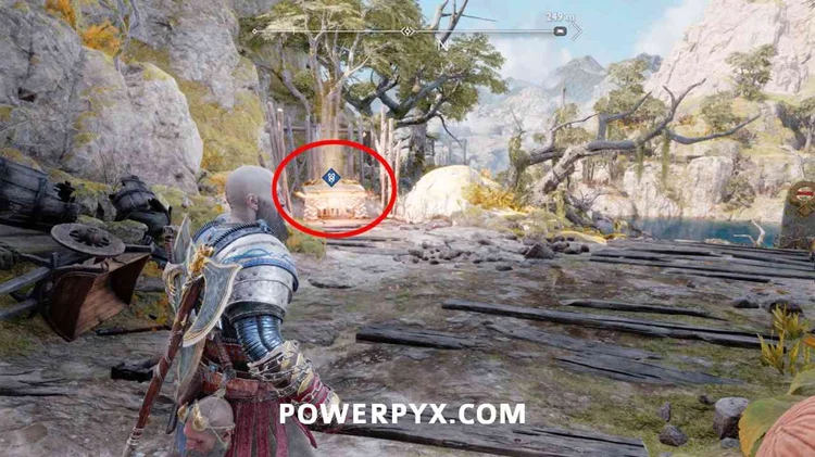 继续沿着左边的路径前进。有一个传说中的箱子卡在某个金色的矿石中。按下:圈:左边燃烧的花瓶抓住一个爆炸弹丸,扔向黄金矿石爆炸。现在你可以打开宝箱了。这个宝箱可以包含一颗穆斯佩尔海姆种子(如果你还没有找到其中的 2 颗)或神圣的灰烬(如果你已经找到了 2 颗穆斯佩尔海姆种子)。