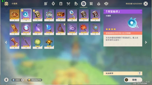 在背包中装备「寻宝仙灵」,召唤「寻宝仙灵」