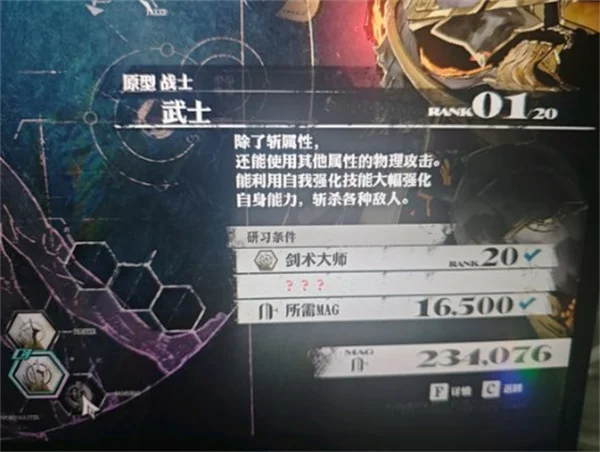 武士的研习条件是:剑术大师20级,将军10级,mag16500。