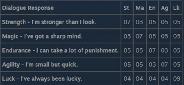 当你第一次到达Grand Trad并在征兵中心申请参军时,在被问到主角的名字之前,你会被提示两个问题。第一个问题似乎并不重要,但第二个问题肯定会影响你的起始属性分布。以下是选择它们的答案和统计结果。