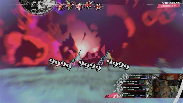 在打完三龙的隐藏boss之后,我们会获得 【末日史书】 ,可以使用能打9999的四人王家合题,但千万不要面对默示录红龙的情况下使用,否则他回头就会给予我们9999的AOE伤害,在装备能够抵抗一次致死伤害装备的情况下,也无法再次面对9999。