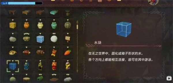 水块是游戏中的一个道具,在无之世界中,固化成箱子形状的水。各个方向上都能相互连接,故可在其中游泳。