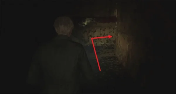 到尽头处用武器砸开下图所示位置的墙壁,侧身进到里面。