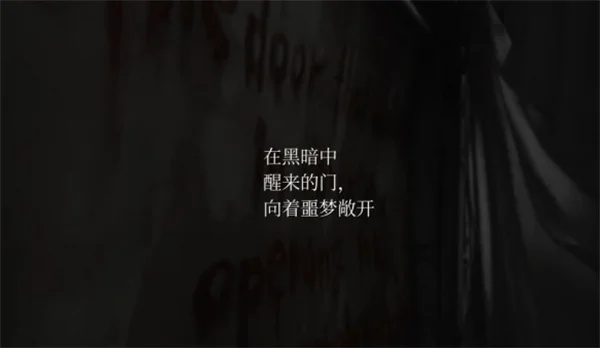 脏污的白布后方,互动后可看到文字“在黑暗中醒来的门,向着梦敞开”。