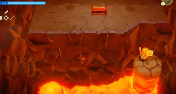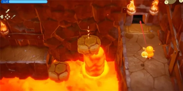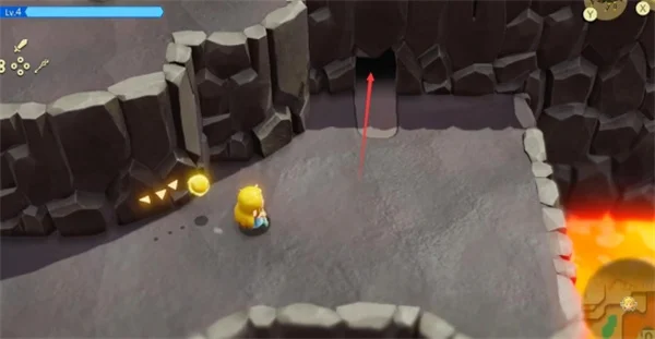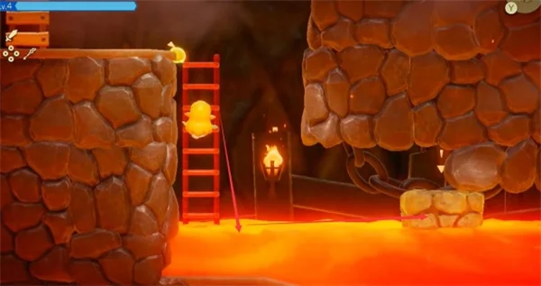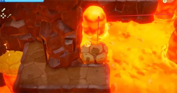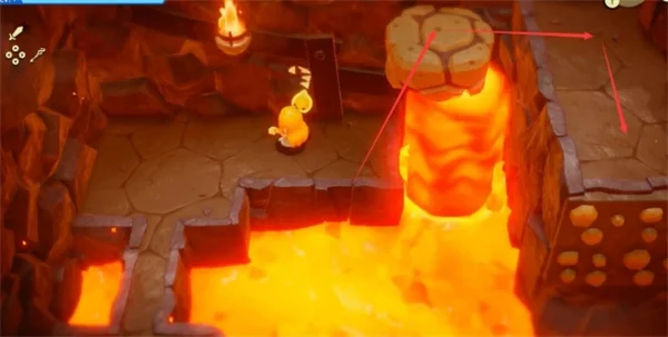 2、来到图示位置从小洞进去来到 【山顶洞窟】 ,利用石头挡住岩浆来到另一个平台;
