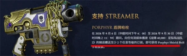 要获得步枪皮肤,请在2024年9月17日(中欧时间凌晨12: 00)至2024年9月30日(中欧时间晚上11: 59)期间观看一小时的《星际战士2》。