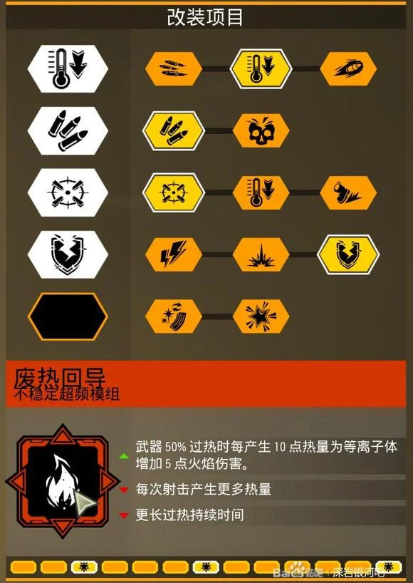 废热回导,如上图,这个模组的描述说的云里雾里的,也并不准确,简单说,就是热量条到达50%之前,它就是一把单发伤害9的普通电浆枪,但当热量条到达50%之后,每发子弹增加6点火伤和6点热量,也就是每发子弹变为15点伤害,同时每发子弹会增加命中单位6点热量值,这样,电浆枪就成为了火系武器,在现在的版本,可以配合其他火系职业,更好的消灭机械单位。这个模组的使用要点,简单说就是控温,控制好射击节奏,把热量条控制在50%以上,进行射击,同时不要轻易让枪过热,热量条快满了,就歇一歇,热量条掉到50%再进行射击。这个模组一样能提供高伤,而且没有降低精准的负面效果,同时能够火属性攻击,唯一的难点就是控温,多注意一下,也不难,是目前版本侦查主流武器模组之一。