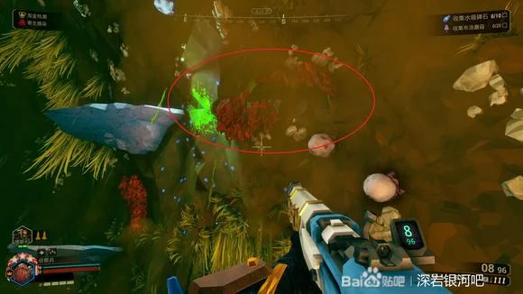 如上图红色圆圈处,当我们回家交完矿后,虽然离刚才的硝石比较远,但只要按下Ctrl,导航点的位置方向信息都会提示出来,根据提示,可以方便找到刚才导航点的位置。