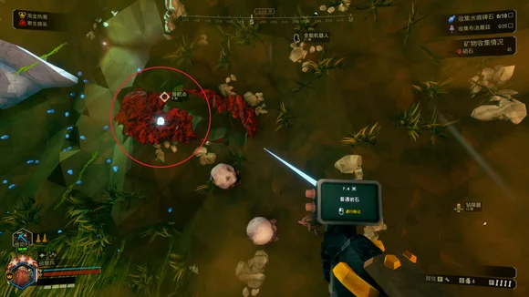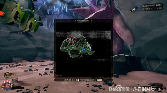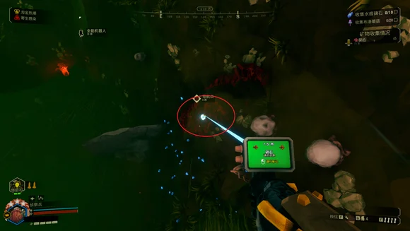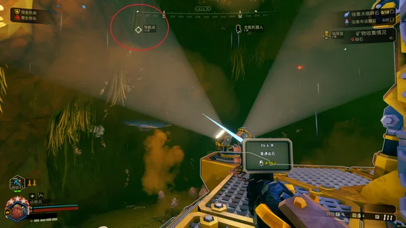 如上图,在水痕碑石和墨菱油提取任务这类没有矿骡的任务中,作为侦查,很容易出现这种尴尬的问题,硝石采了一半身上装满了,需要回基地交矿,但对于路痴的小伙伴来说,很容易回基地交完矿就忘了刚才硝石在哪了,这时候,你可以像上图中一样,通过Ctrl+E,标记出一个蓝色小光点,即导航点。