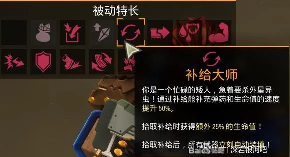 如上图,特长里“补给大师”的效果里有一项作用,就是“通过补给舱补充弹药和生命值的速度提升50%”,简单来说就是吃补给的速度提升50%。
