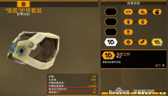 如上图,这个是侦查的护甲,其他职业的护甲也有第四行的这个“喘息之时”,当我们点了这个加点的时候,如红色方框所示,被队友复活后,我们有6秒的无敌时间。