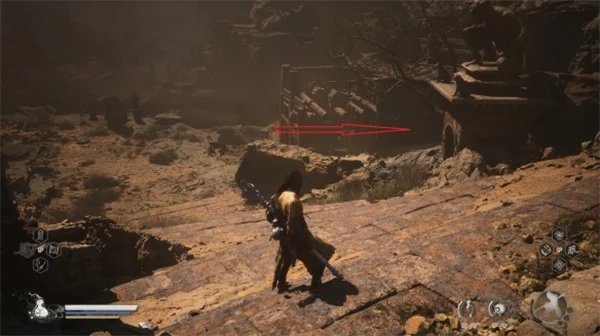 3. 之后到传送点沙门村-不济谷处,从这个传送点出发,在沙国王父子boss战场地用护符打开旁边的捷径大门(也可以从挟魂崖石先锋后面的路绕过去),进门后下楼梯,在桥前面往右转,到达场地中央后摇响第二次拨浪鼓。