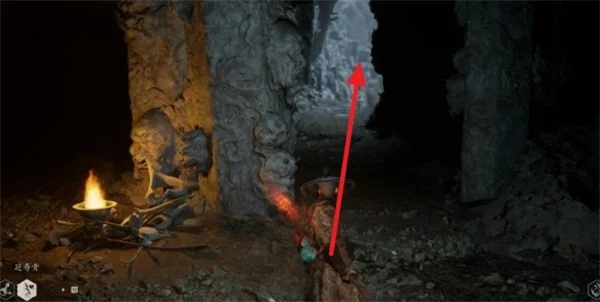 3、在洞口会看到有个火盆,走火盆右侧进入洞口。