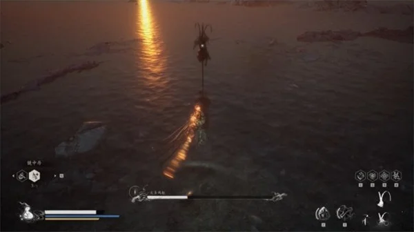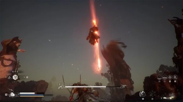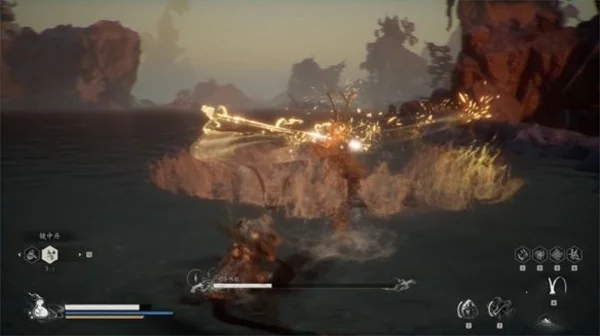 大圣后撤几步跃起跳上筋斗云,然后快速接近攻击,后续会接轻攻击的三连或者劈棍式的回旋劈棍,此招式也很难躲,需要保持移动,或者用聚形散气攻击。