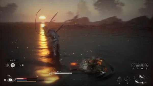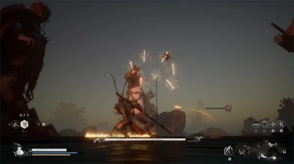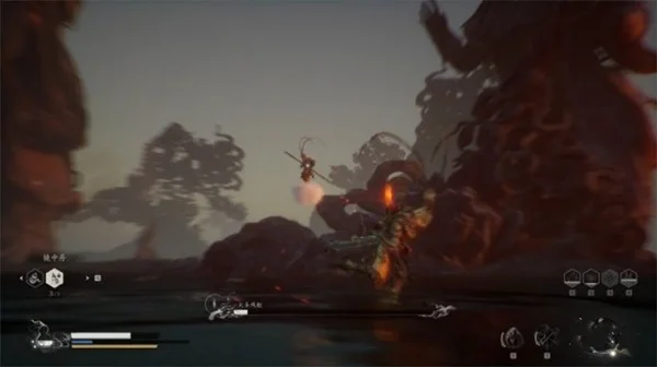 大圣的轻攻击与我们几乎一样,但是棍子更长,且它还会翻滚,小编建议此时我们就不停移动不要靠近猴哥,用四段棍式的长距离攻击消耗即可,并且多保留一点血瓶和法术值作二阶段的最终决战。